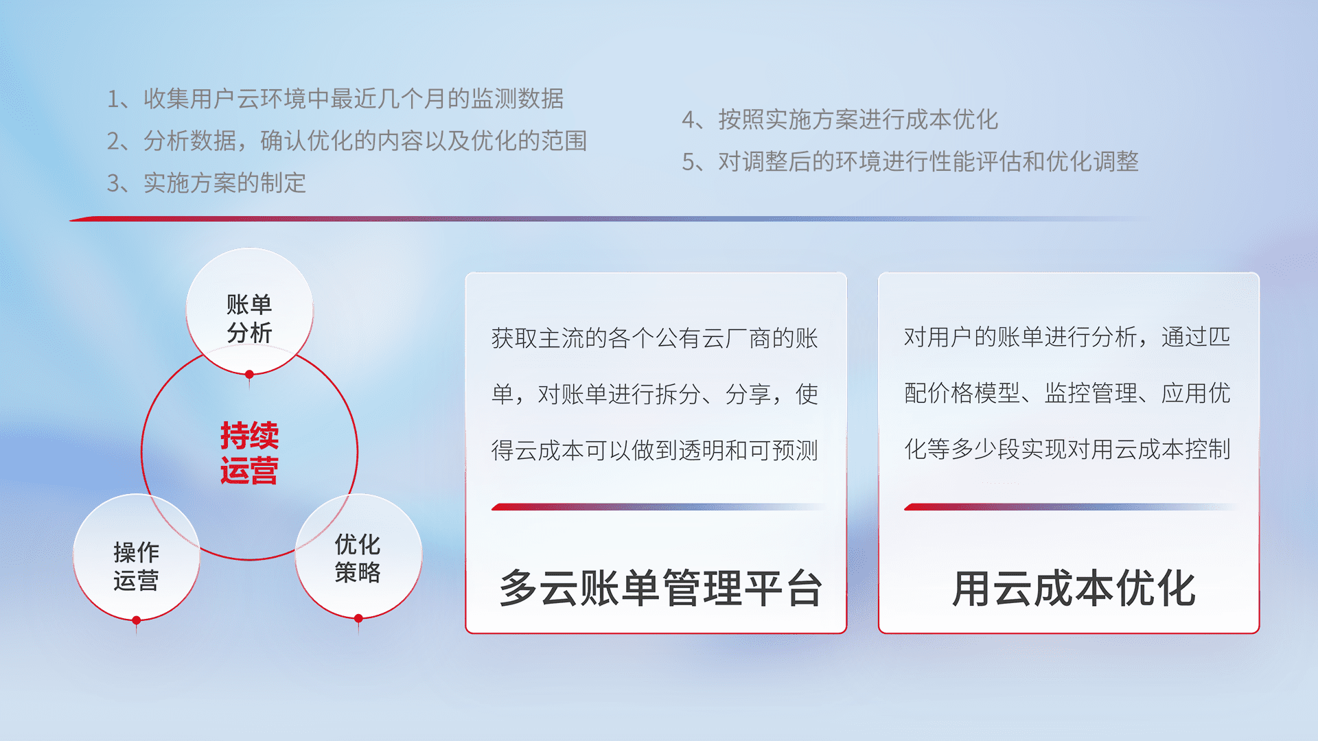 通过多云纳管,,以统一的资源数据模型把客户的云资源进行抽象和封装,,,,进而实现对多云资源的统一操作,,,保障云资源管理的可靠性、、稳定性与可用性。。量身定制化运维内容,,配置、、开发运维、、、补丁管理、、、备份、、、监控、、、认证和访问管理、、审计和日常巡检等,,,,保障在用云过程中的可靠度,,,稳定度以及高可用率。。